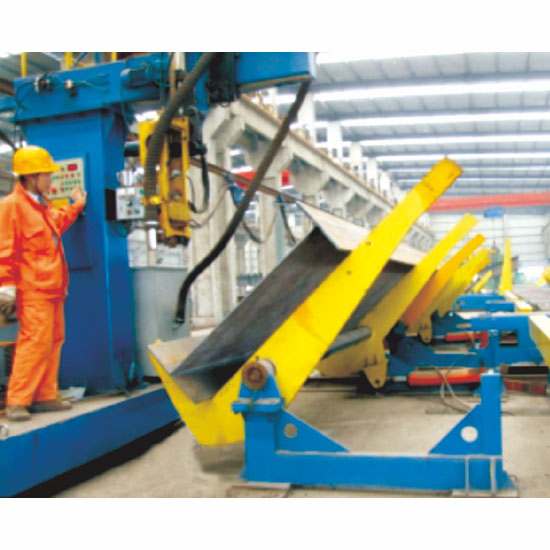 移鋼機 H型鋼組立完畢后,兩臺移鋼機抬起工件送至60°翻轉(zhuǎn)支架上翻轉(zhuǎn)并焊接。