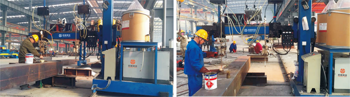 本機采用垂直電渣焊將內(nèi)隔板與周圍鋼板焊接牢固。有熔嘴式與熔絲式二種電渣焊可供客戶選擇。熔嘴式操作簡單,投資省,使用成本高;熔絲式操作復(fù)雜,投資大,使用成本低。